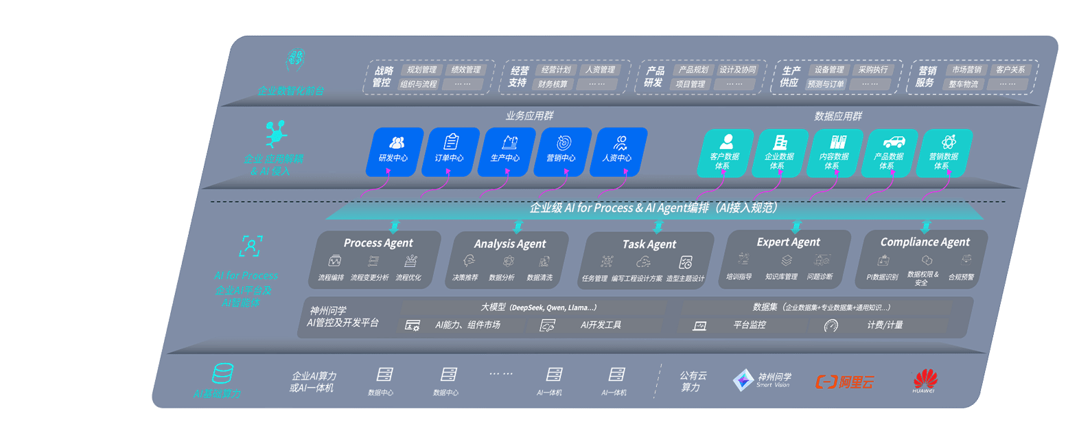 端到端的一站式AI工作空间深度融合了从企业战略规划到日常经营的全流程业务板块,,,定向解决车企内部领域多、、、部门多、、、、链条长、、、、场景碎片化等难题,,支持车企快速构建以AI为核心的生产力写作体系,,实现任务执行与AI能力的无缝集成与交互