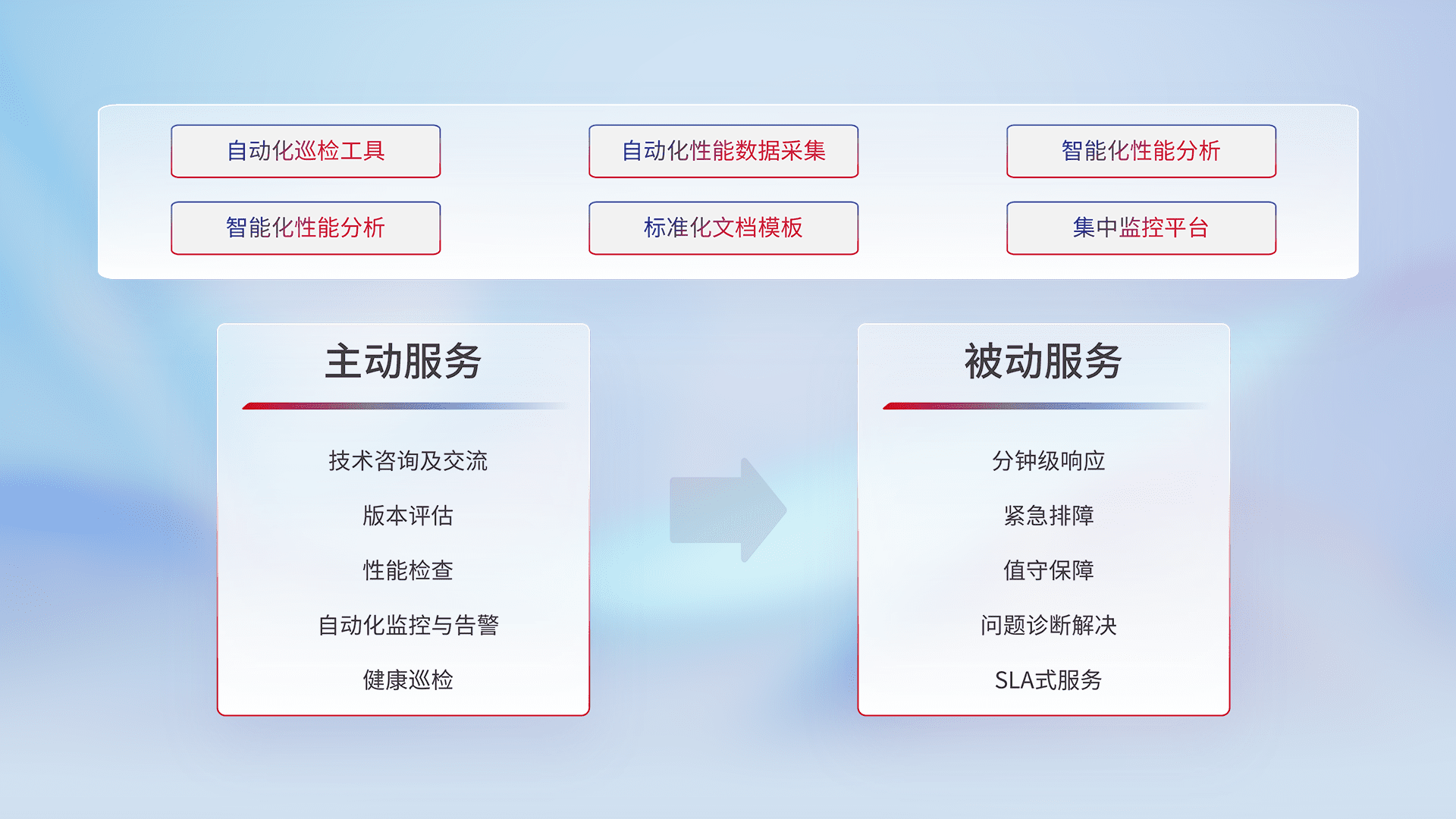 智能化工具和标准化文档,,,保障服务质量,,,,提供主动服务(包含技术咨询、、、版本评估、、、、性能检查、、自动化监控与告警、、、健康巡检)和被动服务包含(分钟级响应、、紧急排障、、、值守保障、、问题诊断解决、、SLA服务)。。